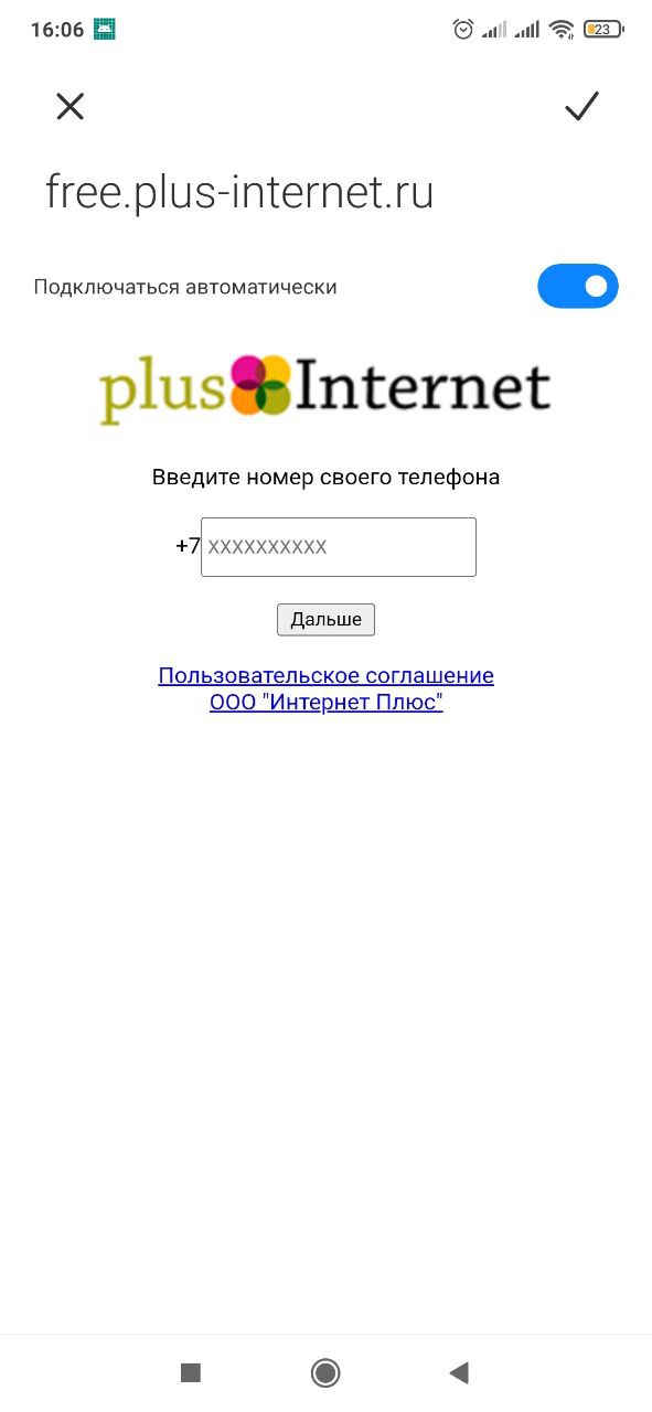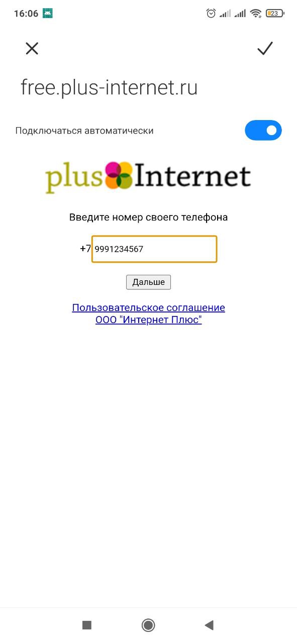 После подключения к точке доступа автоматически появится страница авторизации. Введите номер своего телефона и нажмите на кнопку "Дальше"